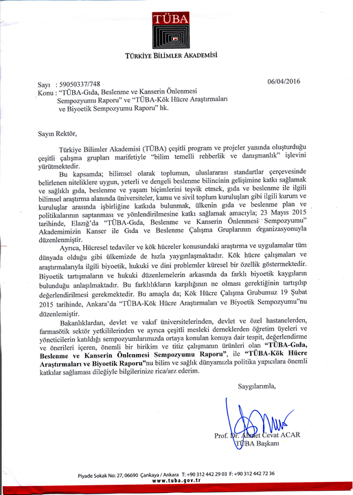 “TÜBA- Gıda, Beslenme ve Kanserin Önlenmesi Sempozyumu Raporu” ile “TÜBA Kök Hücre Araştırmaları ve Biyoetik Raporu” Üniversitemiz Merkez Kütüphanesi’nde yer almaktadır.