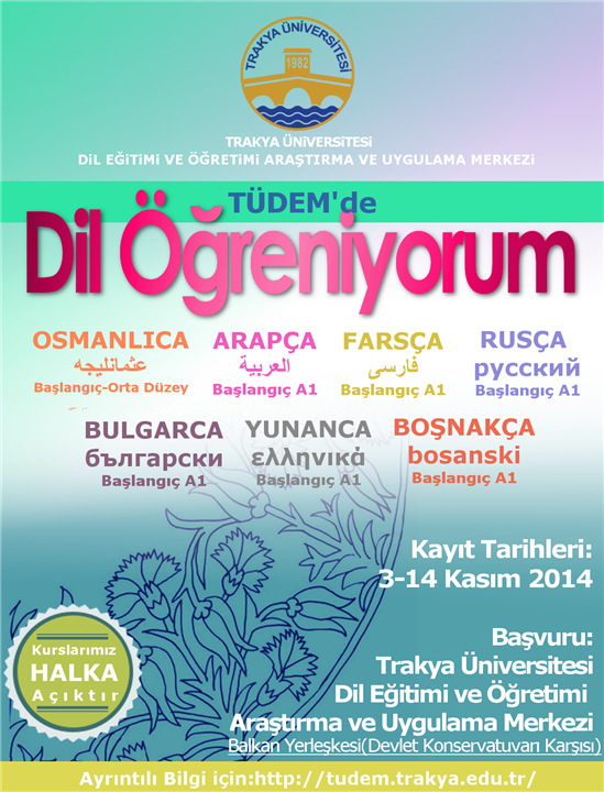 Trakya Üniversitesi Dil Eğitimi ve Öğretimi Araştırma ve Uygulama Merkezi (TÜDEM) tarafından Osmanlıca, Arapça, Farsça, Bulgarca, Yunanca, Boşnakça ve Rusça kursları düzenlenecektir. Kurslara kayıtlar 3-14 Kasım 2014 tarihleri arasında TÜDEM Müdürlüğünde (TÜ Devlet Konservatuvarı karşısı) yapılacaktır.