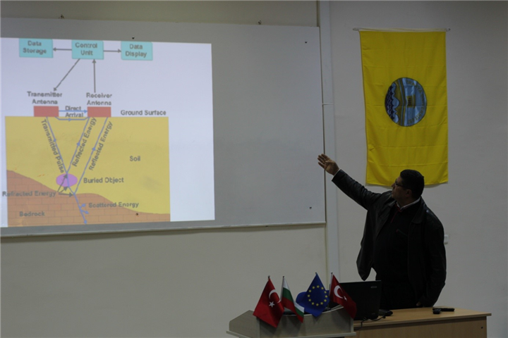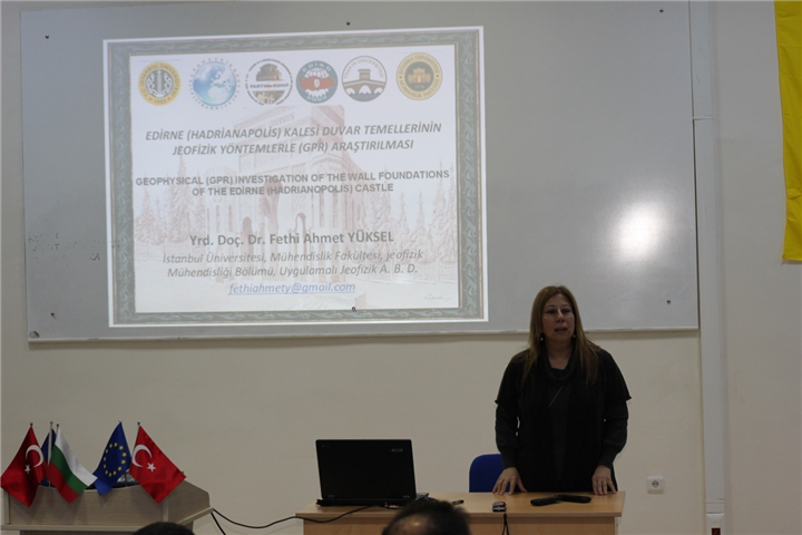 Üniversitemiz Mimarlık Fakültesi Dekanı Prof. Dr. Burcu ÖZGÜVEN’in teknik danışmanlığında sürdürülen Edirne Tarihi Kalesi’nin jeoradar yöntemiyle araştırılmasının hedeflendiği proje kapsamında, İstanbul Üniversitesi Jeofizik Mühendisliği Bölümü öğretim üyelerinden Yrd. Doç. Dr. Fethi Ahmet YÜKSEL tarafından jeoradar çalışmaları yürütüldü ve yeraltındaki tarihi sur kalıntılarına ilişkin çeşitli tespitler elde edildi. Yapılan çalışmaların özetlendiği sunumda, jeoradar yönteminin özellikleri ve örneklemelerin yanı sıra tespit edilen buluntular hakkında bilgi verildi.
