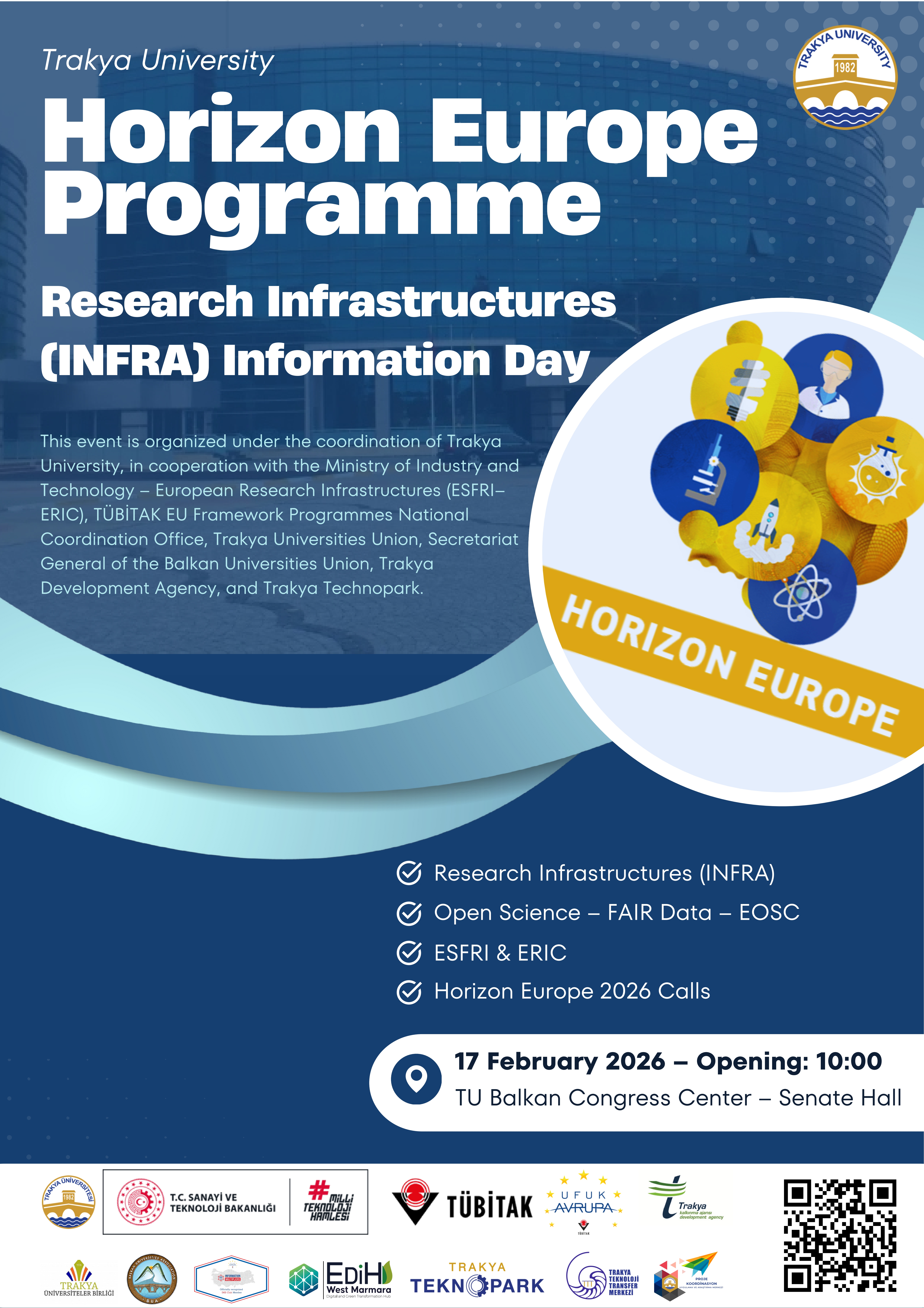 17 Şubat 2026 tarihinde Üniversitesitemiz ev sahipliğinde Sanayi ve Teknoloji Bakanlığı Avrupa Araştırma Altyapıları (ESFRI–ERIC), TÜBİTAK AB Çerçeve Programları Ulusal Koordinasyon Ofisi, Trakya Üniversiteler Birliği, Balkan Üniversiteler Birliği Genel Sekreterliği, Trakya Teknokent ve Trakya Kalkınma Ajansı iş birliğiyle “Ufuk Avrupa Programı Araştırma Altyapıları (Research Infrastructures – INFRA) Bilgilendirme, Tanıtım ve İş Birliği Fırsatları Etkinliği” düzenlenecektir.