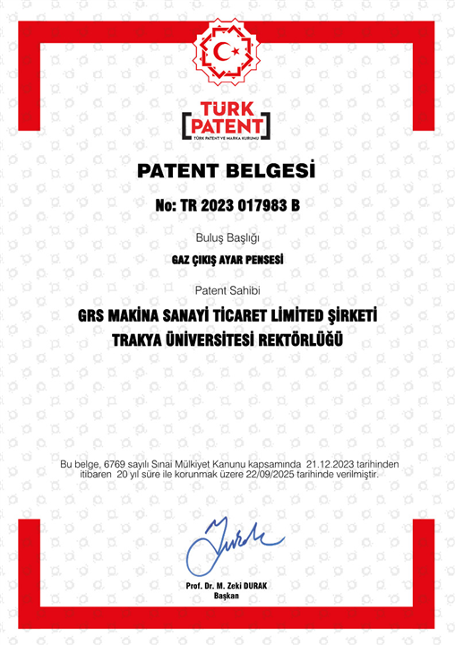 Trakya Üniversitesi Keşan Meslek Yüksekokulu Motorlu Araçlar ve Ulaştırma Teknolojileri Bölümü Yenilenebilir Enerji Teknikerliği Programı öğretim elemanı Öğr. Gör. Dr. Mehmet Ceviz’in yürütücülüğünü üstlendiği “Gaz Çıkış Ayar Pensesi” başlıklı buluş, Türk Patent ve Marka Kurumu tarafından patent belgesi ile tescillendi.