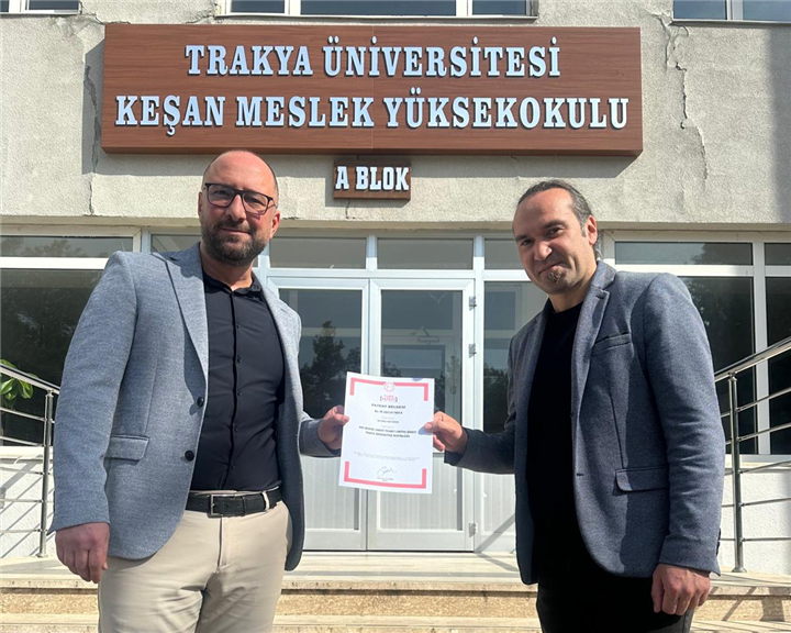 Buluşun patent belgesi Keşan Meslek Yüksekokulu Müdürü Dr. Öğr. Üyesi Aydın Güllü tarafından Öğr. Gör. Dr. Mehmet Ceviz’e takdim edildi.