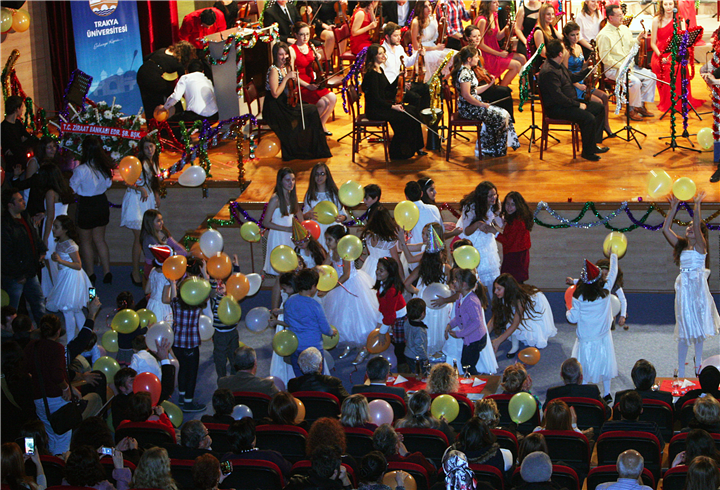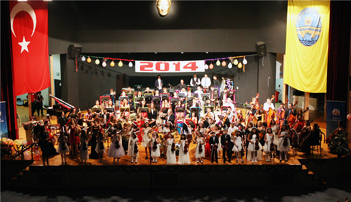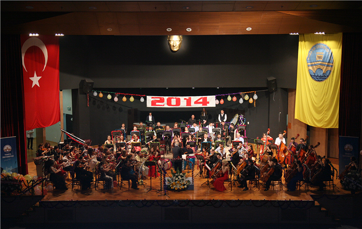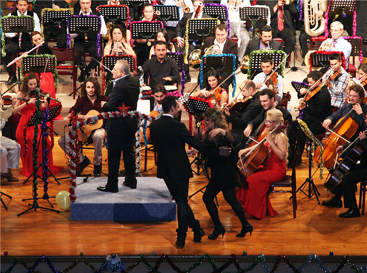 “ Jingle Bells” ile başladı yeni yıl konseri.Minik kemancılar öndeydi. Özgür Sevina’nın düzenlemesini yaptığı “Hababam Sınıfı” uyarlaması filmin fragmanları eşliğinde çalındı. Sahnede Kemal Sunal, Adile Naşit, Münir Özkul...