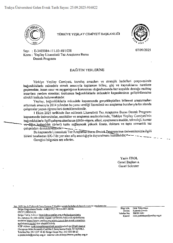 YEŞİLAY LİSANSÜSTÜ TEZ ARAŞTIRMA BURSU DESTEK PROGRAMI