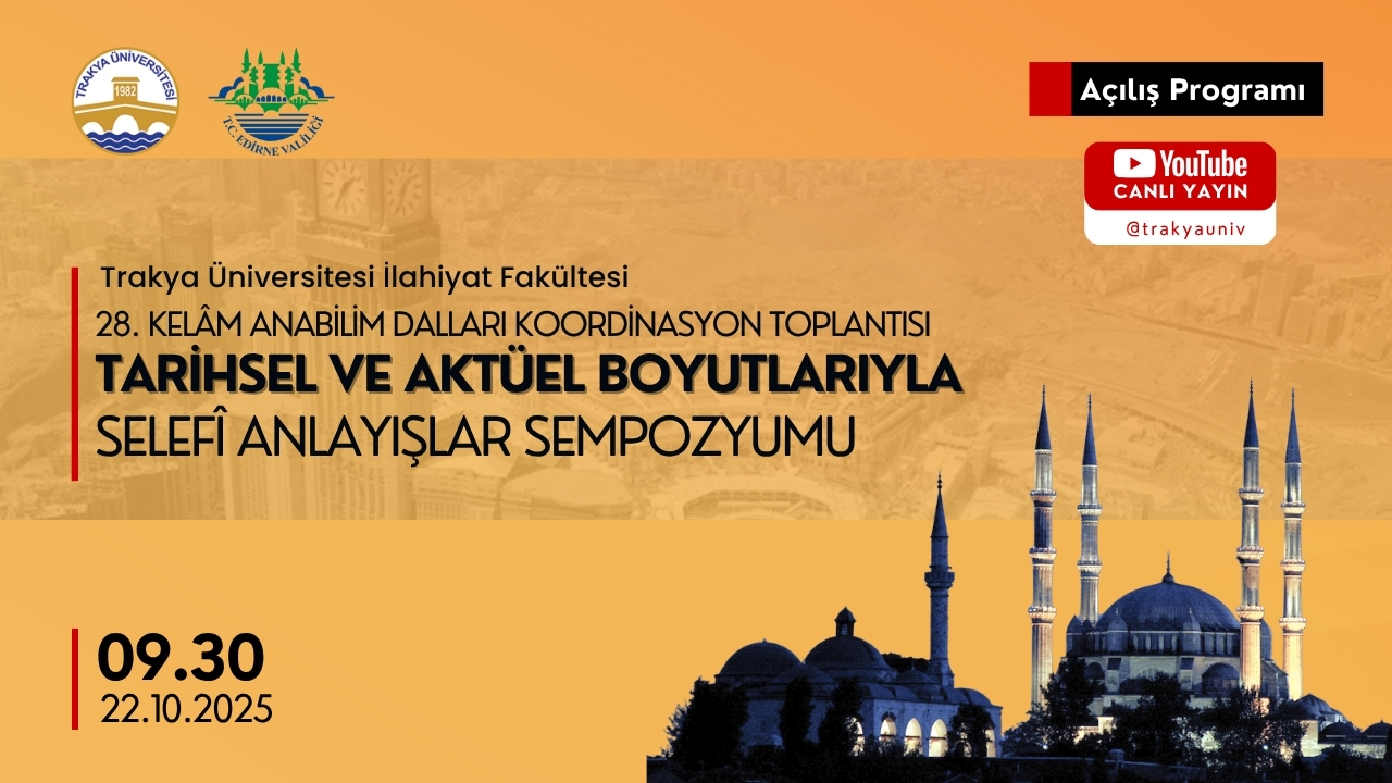 "28. KELÂM ANABİLİM DALLARI KOORDİNASYON TOPLANTISI VE “TARİHSEL VE AKTÜEL BOYUTLARIYLA SELEFÎ ANLAYIŞLAR SEMPOZYUMU" 22 Ekim 2025 (Bugün) 09.30’ da Youtube kanalımızdan canlı yayınla sizlerle..