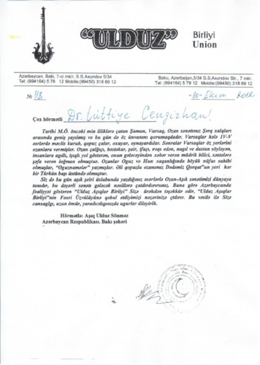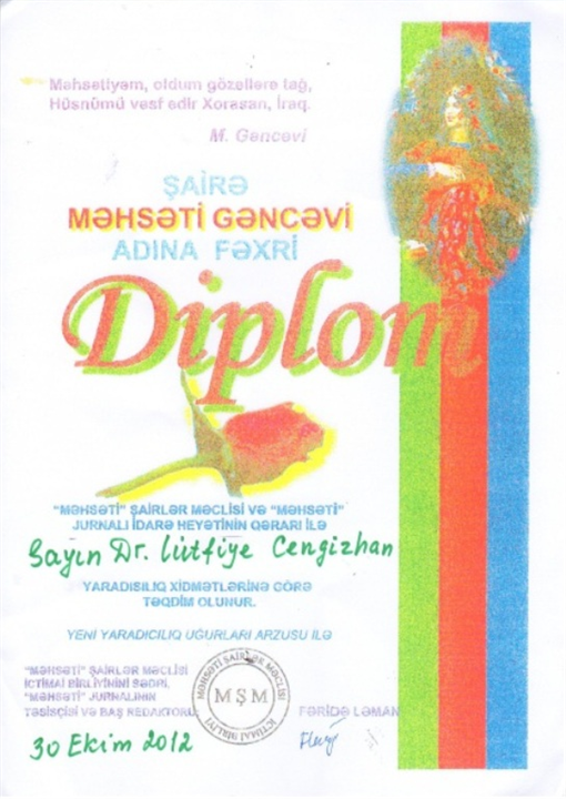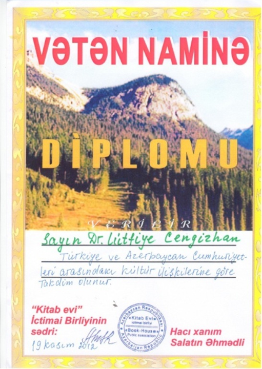 Üniversitemiz tarafından 18-20 Ekim 2012 tarihlerinde gerçekleştirilen "Uluslararası Dil, Yazın, Deyişbilim Sempozyumu"nda sempozyum başkanlığı yapan Eğitim Fakültesi Öğretim Üyesi Yrd. Doç. Dr. Lütfiye CENGİZHAN'a Azerbaycan Devleti ve Edebi Kuruluşları tarafından fahri diploma verildi.