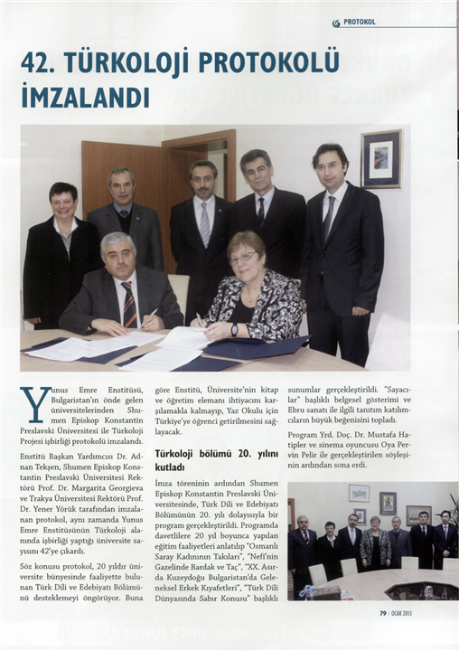 Yunus Emre Bülteni Ocak 2013'te yayınlanan sayısında Üniversitemiz Rektörü Prof. Dr. Yener YÖRÜK'ün yazısı ve Üniversitemiz ile Shumen Üniversitesi ile İmzalanan Türkoloji Protokolü haberi yayınlandı.